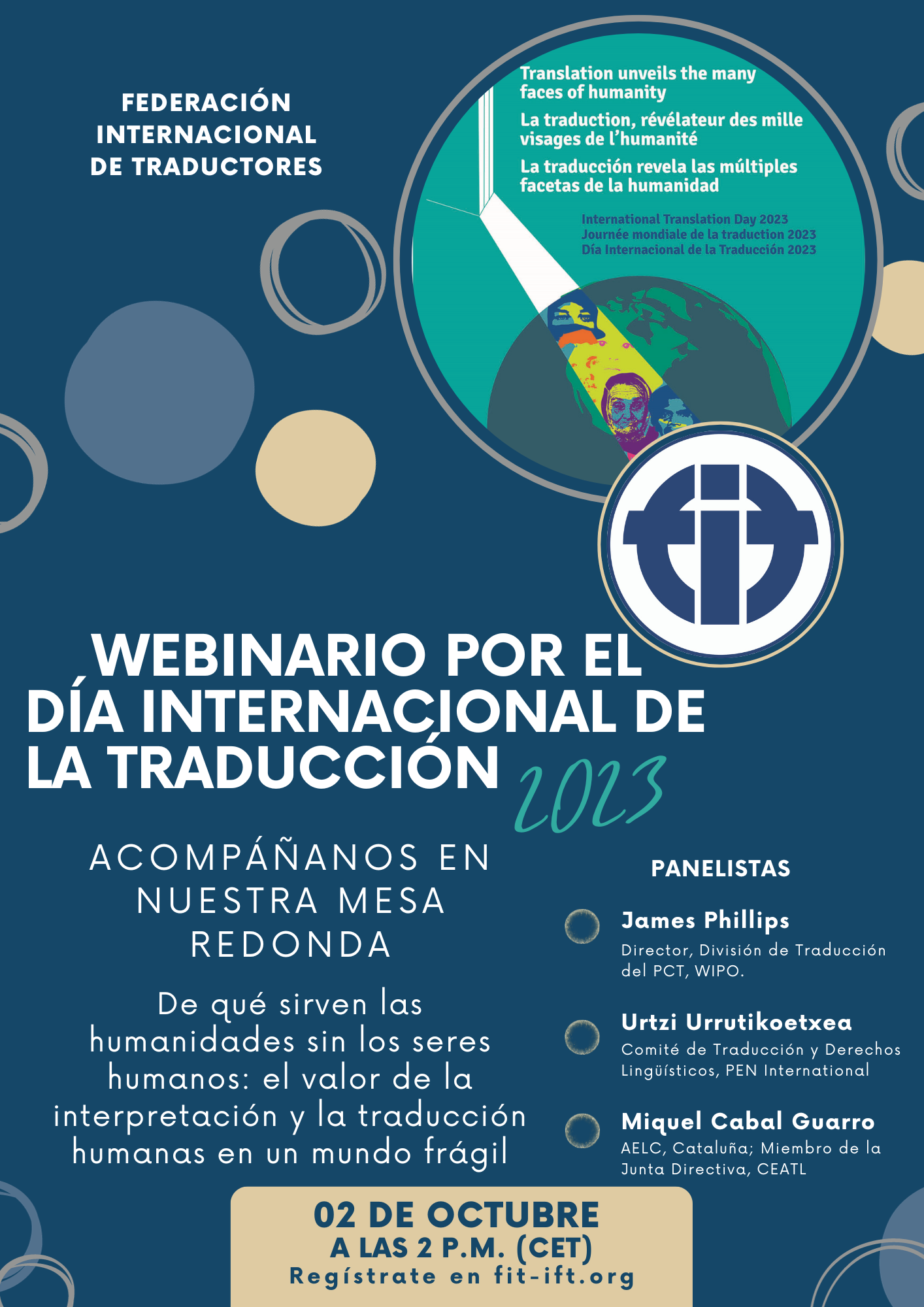 ¡Acompáñanos en nuestra mesa redonda! Webinario por el Día Internacional de la Traducción 2023 2 de octubre a las 2 p.m. (CET) Tema : De qué sirven las humanidades sin los seres humanos: el valor de la interpretación y la traducción humanas en un mundo frágil PANELISTAS Miquel Cabal Guarro. AELC, Cataluña; Miembro de la…
