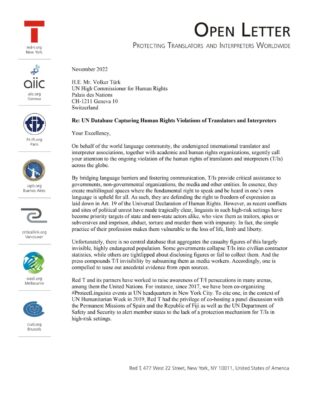 11 de noviembre de 2022. En nombre de la comunidad lingüística mundial, esta carta de la coalición internacional de la comunidad lingüística, incluidas las asociaciones de traductores e intérpretes, llama urgentemente la atención sobre la continua violación de los derechos humanos de los traductores e intérpretes (T/I) en todo el mundo y pide a Volker Turk, Alto Comisionado de las Naciones Unidas para los Derechos Humanos, que registre las violaciones de los derechos humanos contra los T/I.